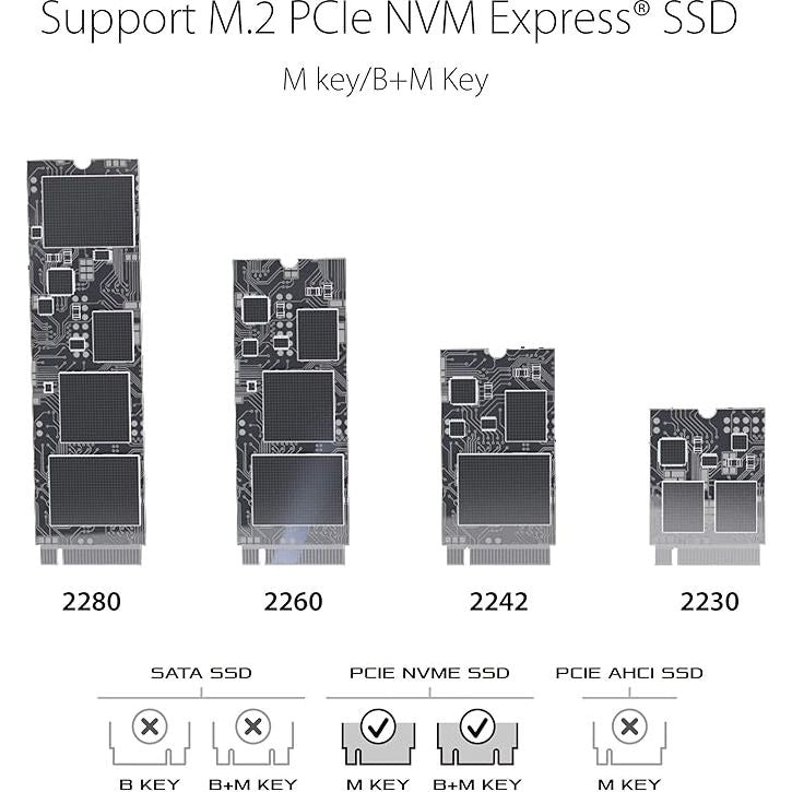 - Supports M.2 PCIe NVM Express SSD with 2230/2242/2260/2280 form factor